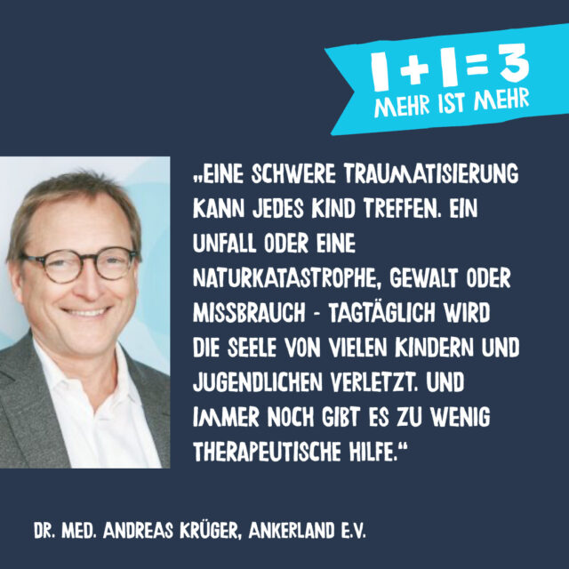 „Wir dürfen traumatisierte Kinder und deren Familien nicht im toten Winkel der Gesellschaft vergessen“, so Dr. Andreas Krüger, Facharzt für Kinder- und Jugendpsychiatrie und -psychotherapie, der sich mit Ankerland e.V. dafür einsetzt, die therapeutische Versorgung in Deutschland zu verbessern.